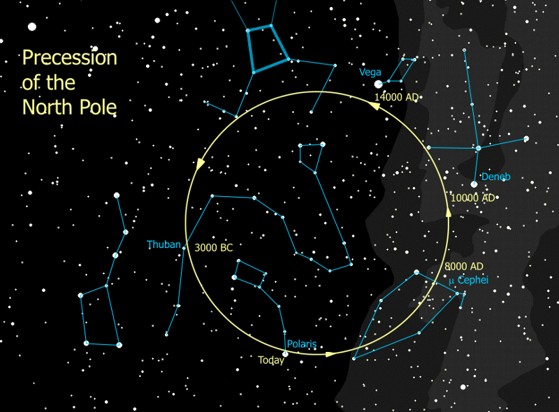 And it's not just a little wobble either! It's a full 47°, enough to make the truly bright star Vega the "new North Star" 12,000 years from now. The official name for this effect is called ‘precession’. Rather than try and describe this I've found a couple images on the internet that very clearly demonstrate this: