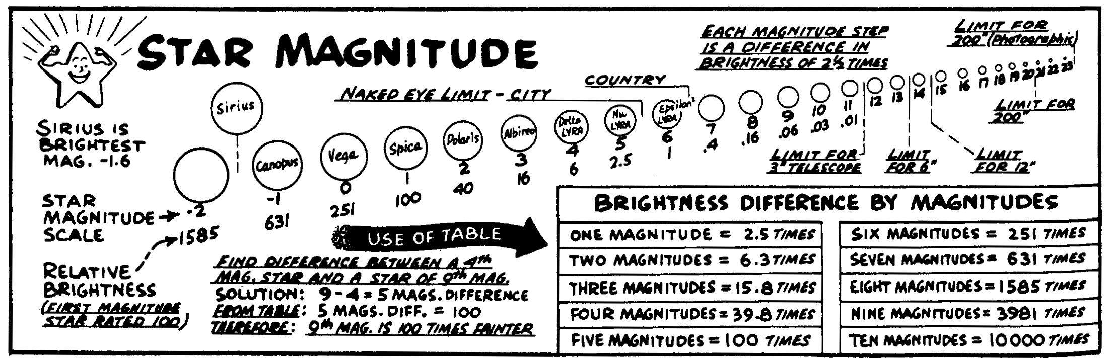 There is a ton of great information about the magnitude scale contained in the chart above including how dim you can see with the naked eye and telescopes of various sizes; the difference between city and country viewing sites and how to compare various brightness magnitudes with 2.5 times difference per mag.